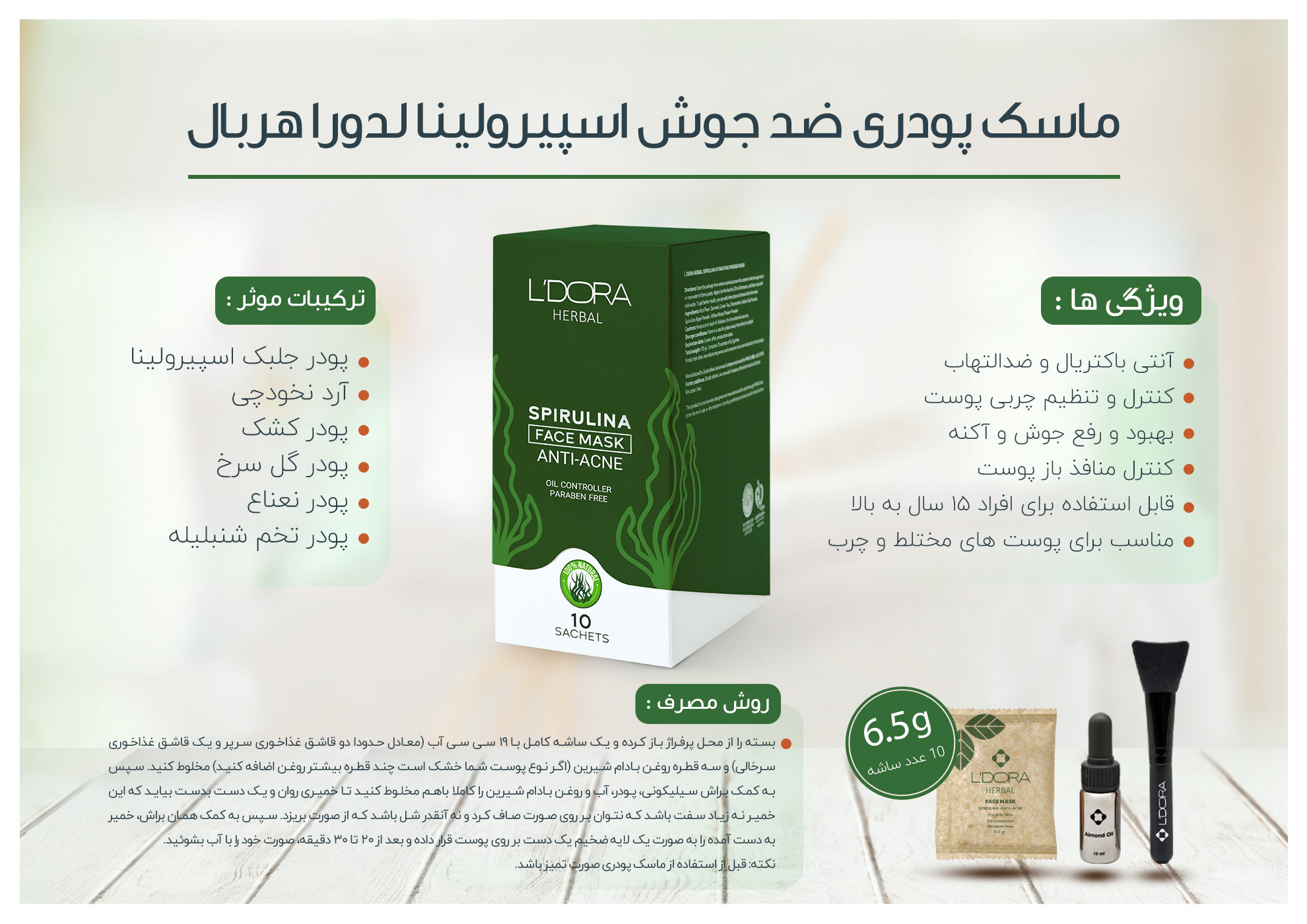 ماسک پودری اسپیرولینا ضدجوش لدورا هربال 10عددی