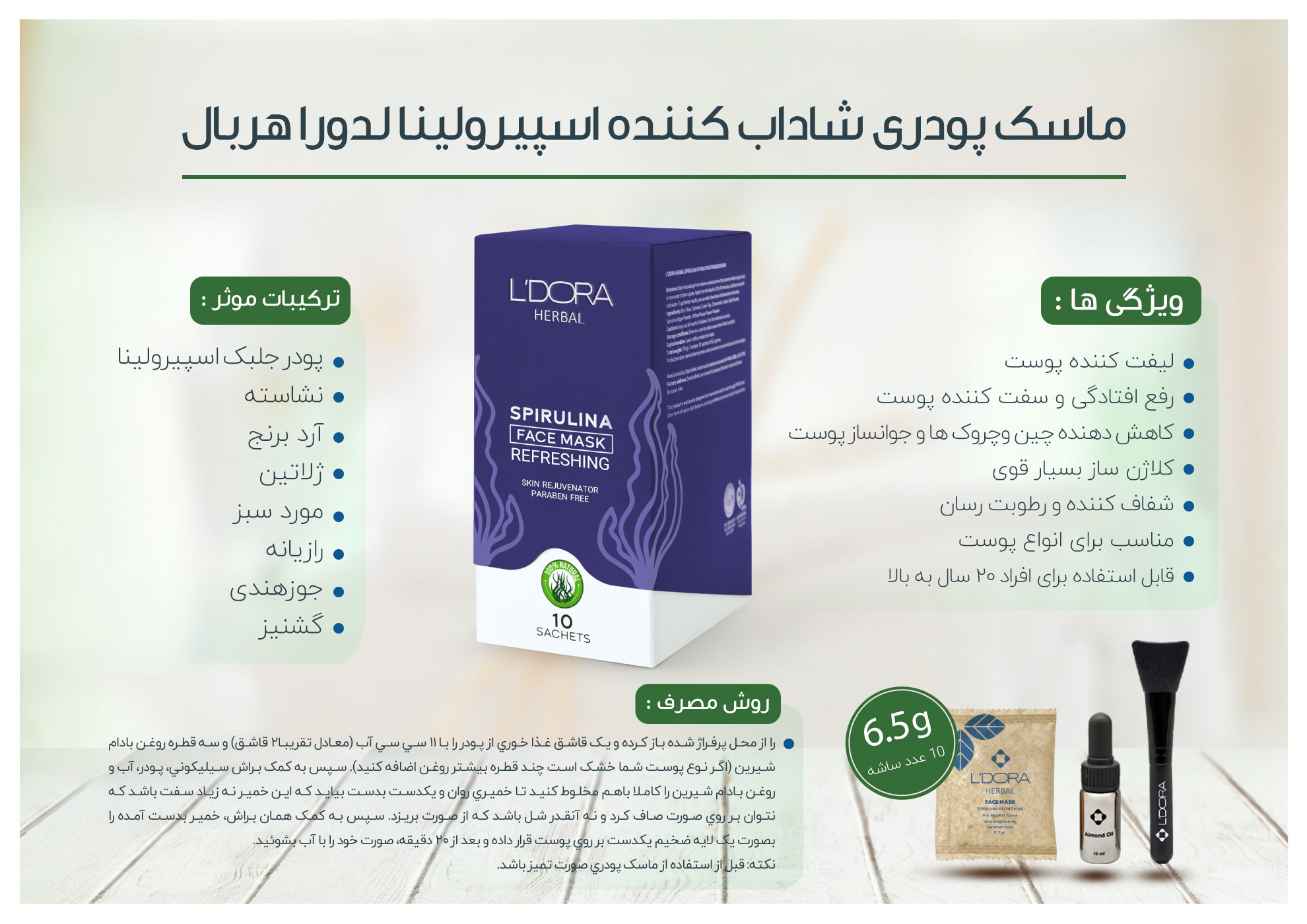 ماسک پودری اسپیرولینا شاداب کننده لدورا هربال 10 عددی