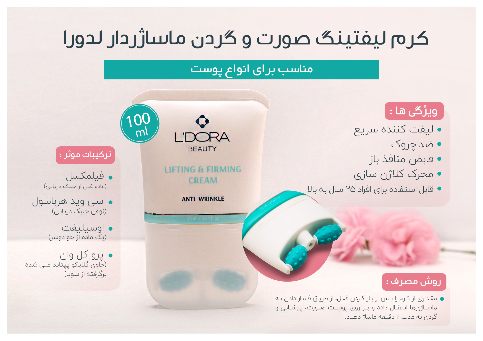 کرم لیفتینگ صورت و گردن ماساژوردار لدورا 100 میلی لیتر